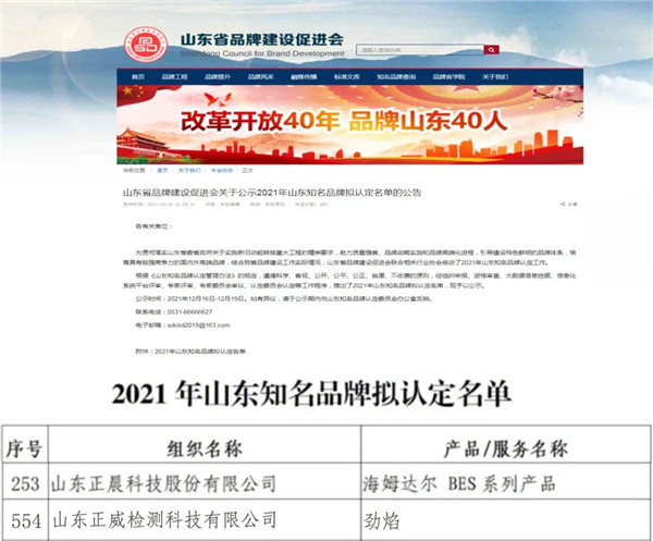 近日,山东省品牌建设促进会公布了2021年山东知名品牌拟认定名单,九游体育(中国)官方网站科技HAMDELL/海姆达尔(BES系列产品)品牌、权属单位正威检测劲焰品牌凭借过硬的实力和强大的品牌影响力双双登榜。