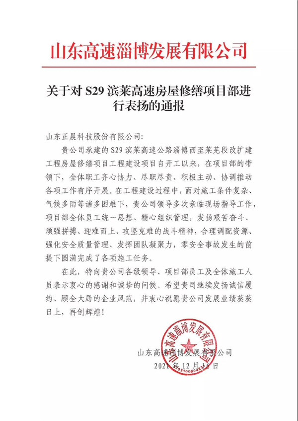 近日,九游体育(中国)官方网站承建的S29滨莱高速公路淄博西至莱芜段改扩建工程房屋修缮项目获得业主表扬!