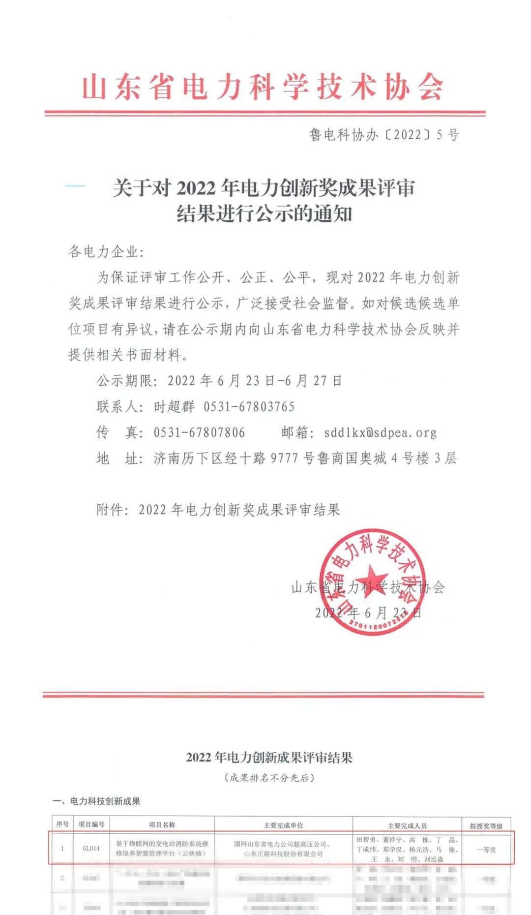 近日,九游体育(中国)官方网站与国网山东省电力公司超高压公司联合研发的《基于物联网的变电站消防系统维修保养智慧管理平台(云快修)》通过了山东省电力科学技术协会评审,荣获2022年电力科技创新成果一等奖,并获推荐申报中国电力企业联合会2022年度电力创新奖。