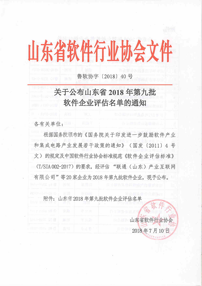 近期,根据国务院颁布的《国务院关于印发进一步鼓励软件产业和集成电路产业发展若干政策的通知》的规定及中国软件行业协会标准规范《软件企业评估标准》的要求,经过山东省软件协会的严格审查,九游体育(中国)官方网站通过了软件企业认定的严格评审程序,被授予山东省2018年第九批软件企业。